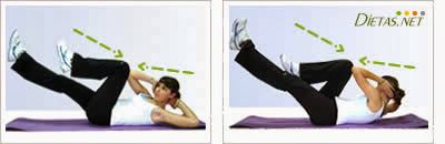 4º) Abdominales (1/2 abdominales, levantar las escapulas es suficiente). Haremos 10 rr hacia delante y 10 rr trabajando el oblícuo. Recuerda que en la acción concéntrica debes expulsar el aire para favorecer el trabajo del cinturón abdominal.
